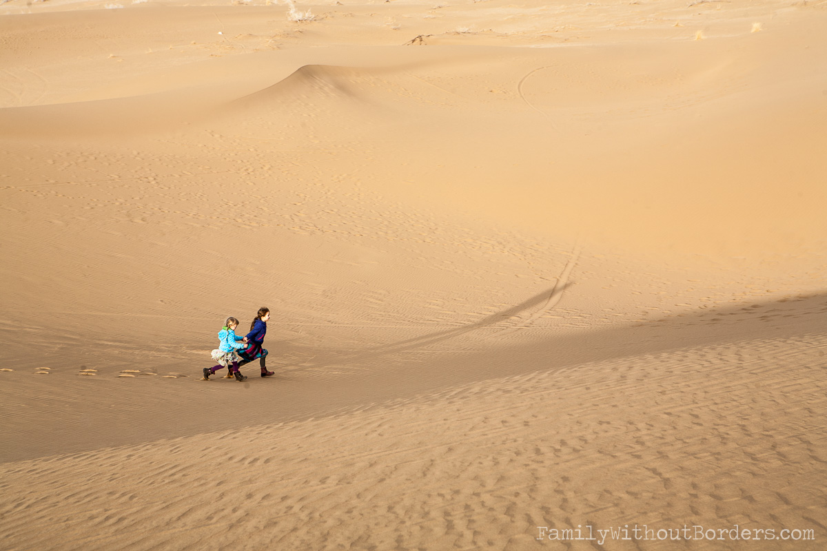 Hanna and Mila running together in the desert in Iran