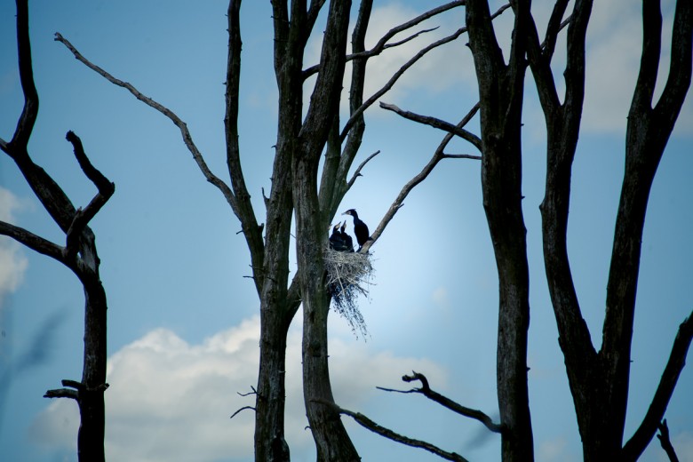 Ein Komoran füttert seine Jungen im Naturpark Flusslandschaft Peenetal, Anklam