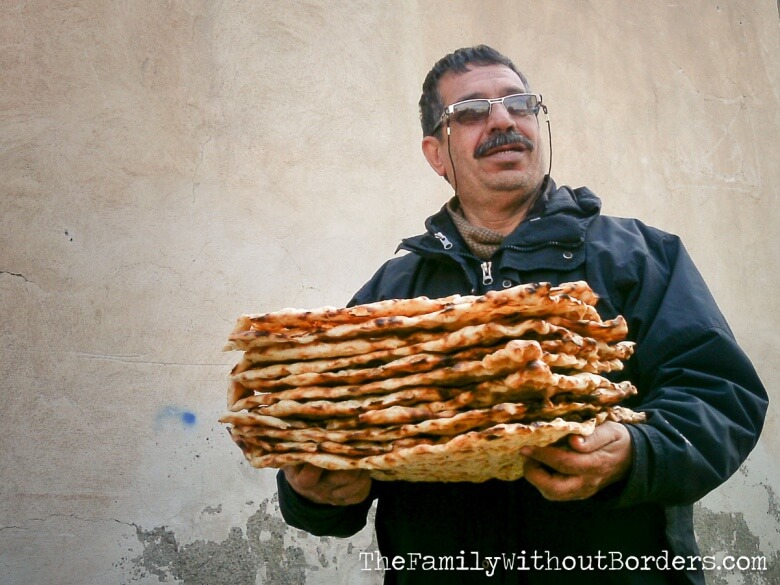 A man with sangak – one of the traditional Iranian breads (Kashan; Iran)