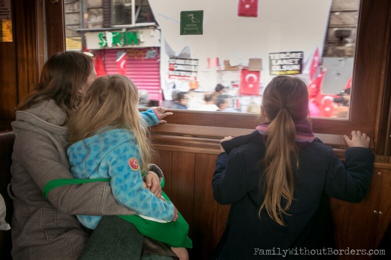 In the historic tram on Istikal Street between Taksim square and Galatar Tower (Istanbul, Turkey)