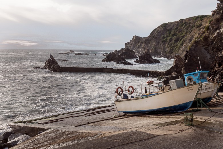 In impressive coastline in Praia da Entrada da Barca, Portugal