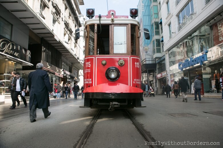 The historic tram line runs on Istikal Street between Taksim square and Galatar Tower (Istanbul, Turkey)